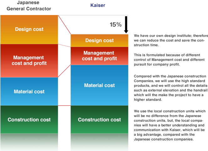 Firstly, no matter project construction (green part) is executed by Japanese EPC Company or Kaiser Company, since the construction work is done by Chinese local construction company, there will no be a big difference in price as long as it is the same project. However, what is most important in construction is the good communication and coordination with construction staffs. Kaiser Company has excellent communication and coordination, which is the advantage that Japanese EPC company can not compete.