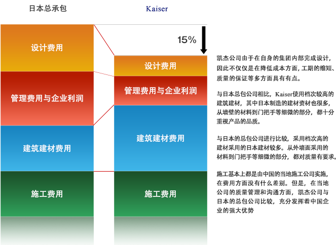 首先,施工費用(綠色部分),無論是日本總承包公司還是Kaiser,均采用中國當(dāng)?shù)氐氖┕す臼┕?,所以只要是相同項目,在費用上不會有差異。但是施工中最重要的與具體施工人員順暢溝通的這一點,Kaiser作為中國當(dāng)?shù)仄髽I(yè)的優(yōu)勢就顯現(xiàn)出來了,迅速、靈活的聯(lián)絡(luò)及管理是日本總承包公司無法比擬的。