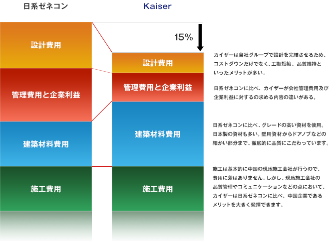 まず、施工(緑の部分)は、日系ゼネコンでもカイザーでも中國(guó)の現(xiàn)地施工會(huì)社に発注するので、同じ案件ですと、かかるコストも同じになります。ただ、現(xiàn)場(chǎng)で最も大切なのは施工擔(dān)當(dāng)者との円滑なコミュニケーション。カイザーは、中國(guó)ネイティブ企業(yè)の利點(diǎn)を生かし、スピーディーかつ柔軟な連絡(luò)、管理を行っています。