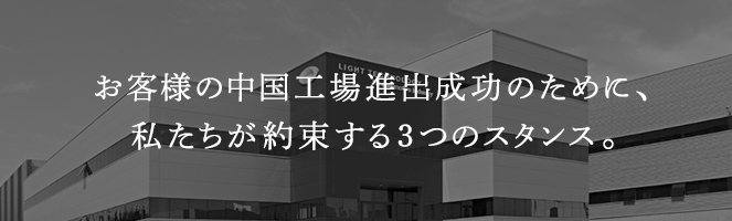 このように、私たちは、お客様の中國(guó)工場(chǎng)進(jìn)出を最初から最後まで、責(zé)任を持って真摯に取り組んでいます。 より良いものづくりをすること、より良いサービスを提供すること。 それは、何よりもお客様に満足いただくための私たちの約束なのです。